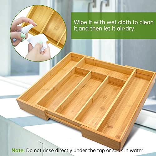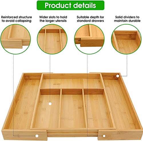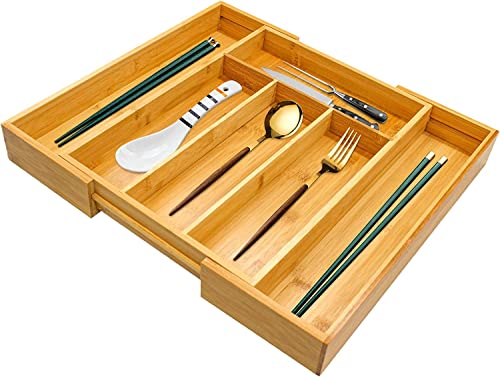 Senbos - منظم ادوات المائدة الفضية من الخيزران، صينية قابلة للتوسيع لتنظيم درج المطبخ وحامل الاواني، صينية ادوات مائدة قابلة للتعديل