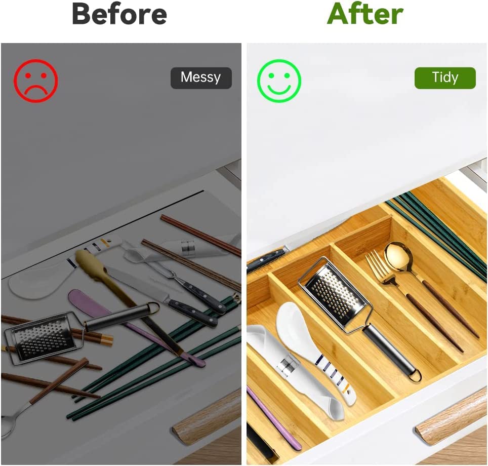 - هيكل قوي وسهل الصيانة: منظم أدراج أدوات المطبخ هذا قوي بما يكفي لتخزينه في مكانه. كما أن منظم الخيزران هذا سهل التنظيف للغاية، فقط امسحه بسرعة بالماء الدافئ وقطعة قماش مبللة.
