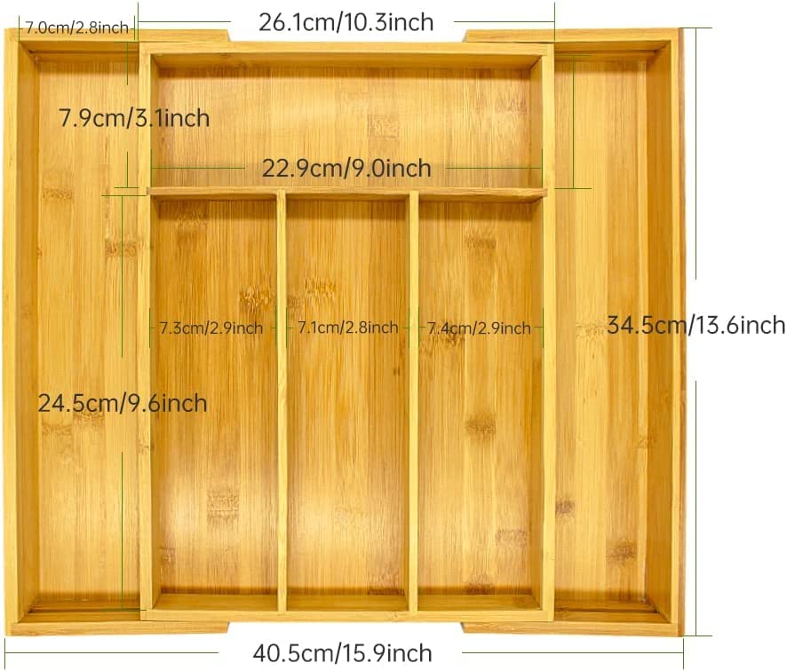 - ملحق مطبخ لا غنى عنه: يسمح اللون المحايد والخشب الرائع لمنظم درج الأواني الفضية الخاص بنا بالاندماج بأناقة مع أي ديكور، وهو يناسب معظم الأدراج ذات الحجم القياسي. تضمن القاعدة المعززة والمقصورات العميقة متانة إضافية وتوفر مساحة تخزين كبيرة لمنظم أدراج قابل للتوسيع يلبي جميع احتياجاتك.