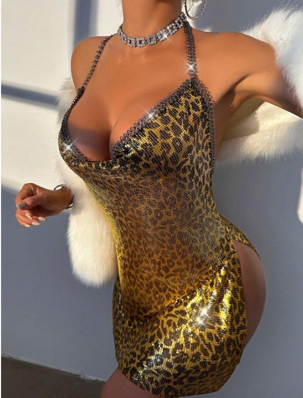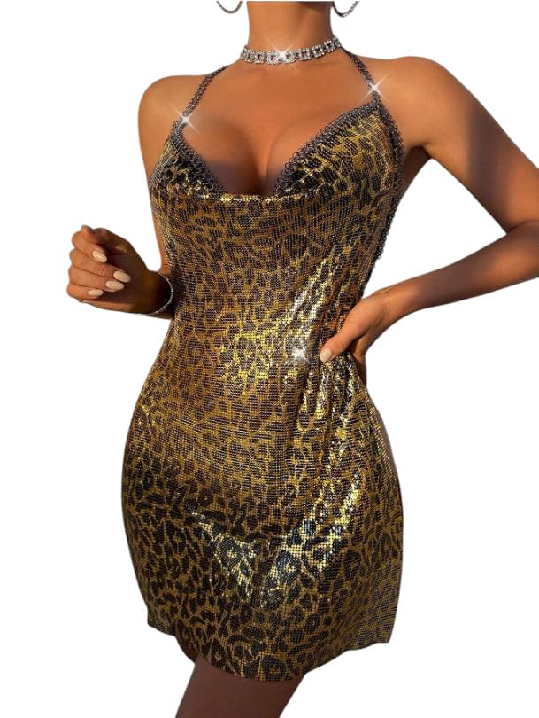 Generic - فستان قصير مزين بالترتر بنقشة جلد الفهد ورقبة برباط وبودي كون للحفلات