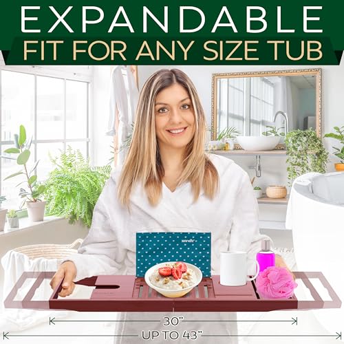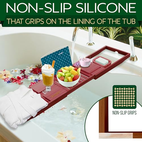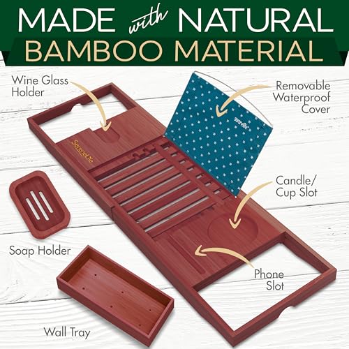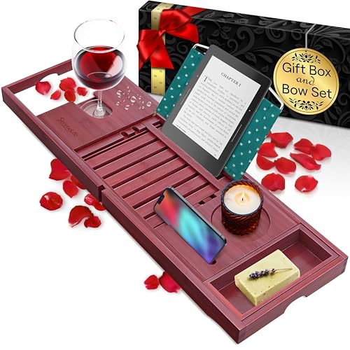 SereneLife - سيرين لايف علبة حوض استحمام فاخرة من الخيزران مع صندوق هدايا ملون وشريط - صينية حمام قابلة للتمدد والتعديل وملحقات حوض الاستحمام الساخن، منظم حمام مع حامل هاتف/كؤوس نبيذ/كتاب (بني)