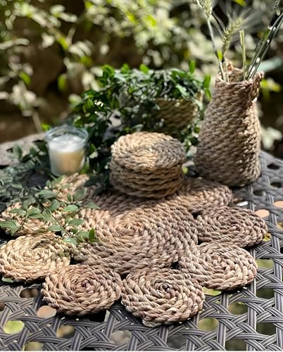 - قاعدة أكواب منسوجة يدويًا مصنوعة من القش الطبيعي بتصميم فريد على شكل وردة، تمزج بين الأناقة والفن لأي إعداد لتناول الطعام أو مشهد تصوير فوتوغرافي.