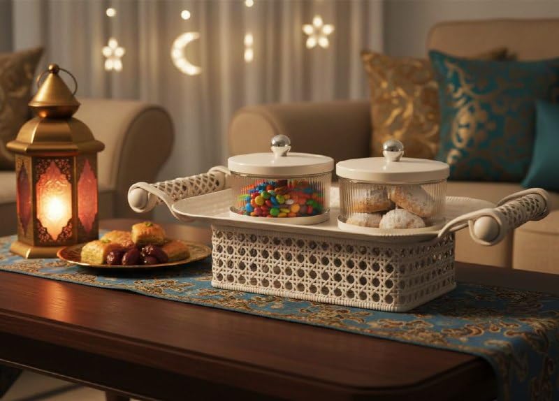 - مناسب لتقديم الحلويات، المقبلات، أو التمر، مع إمكانية ترتيب الأصناف بشكل واضح يسهل على الضيوف التناول