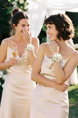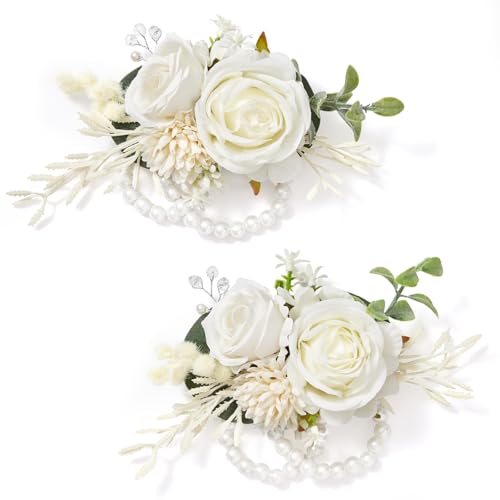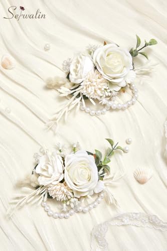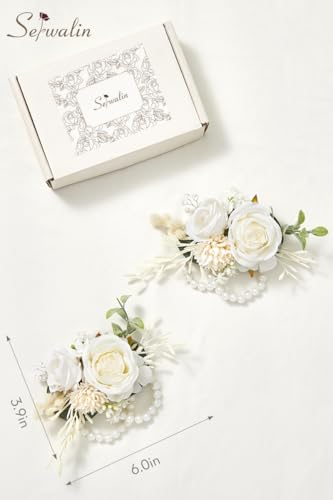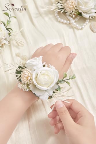 Serwalin - سيروالين سوار معصم ابيض من قطعتين لحفلات الزفاف، سوار معصم لوصيفة العروس والام والجدة والفتاة، زهور صناعية لحفلات التخرج والذكرى السنوية والعودة للوطن