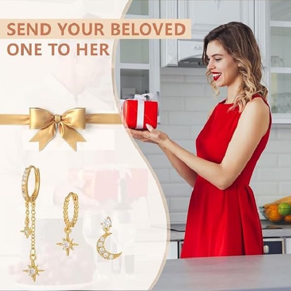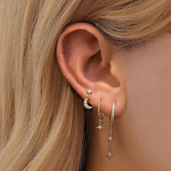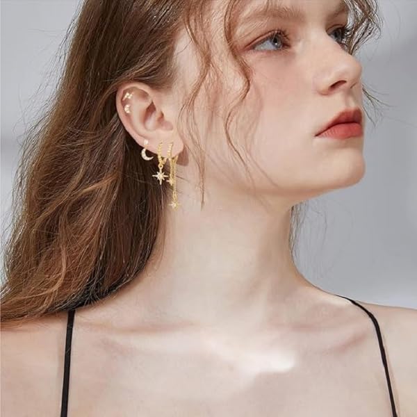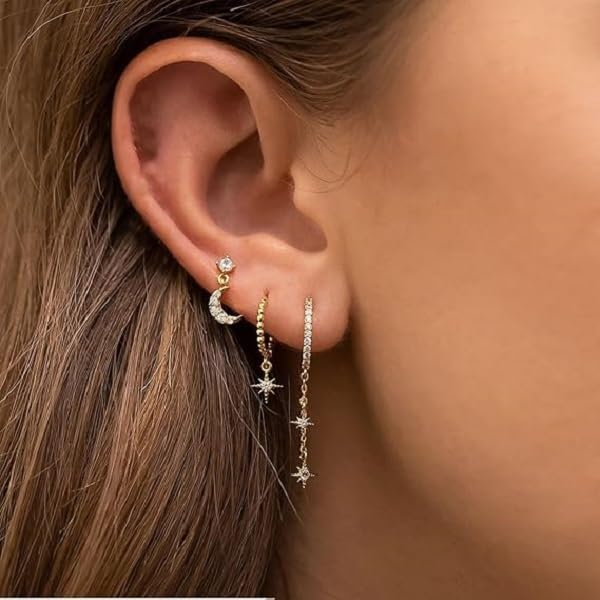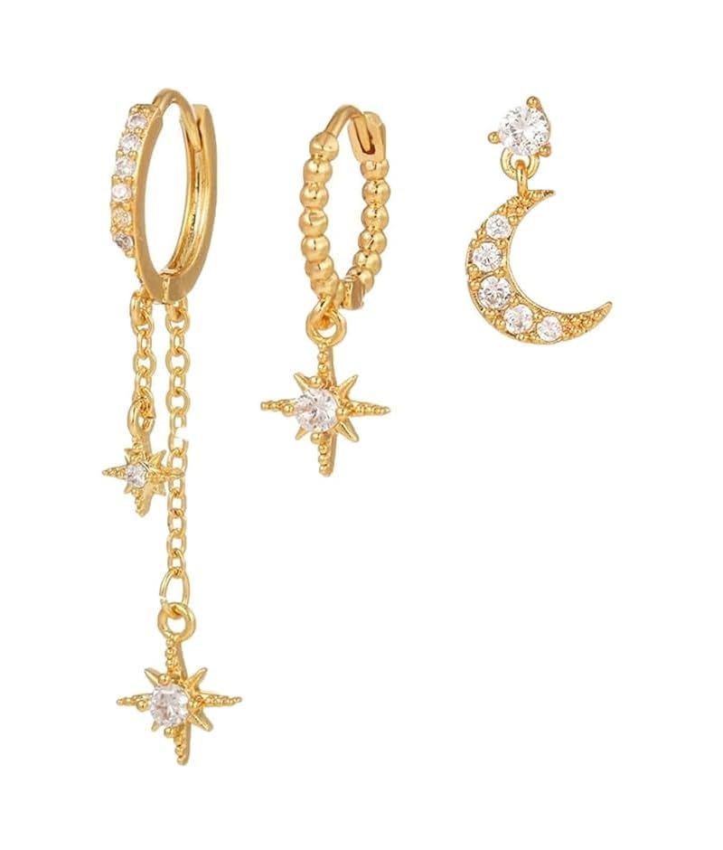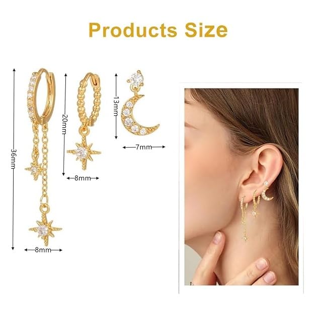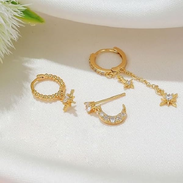 fashion mania - مجموعة اقراط حلقية متدلية مطلية بالذهب على شكل نجمة وقمر مكونة من 3 قطع لاقراط ثقب متعددة انيقة مضادة للحساسية من الزركونيا مع قلادة للنساء