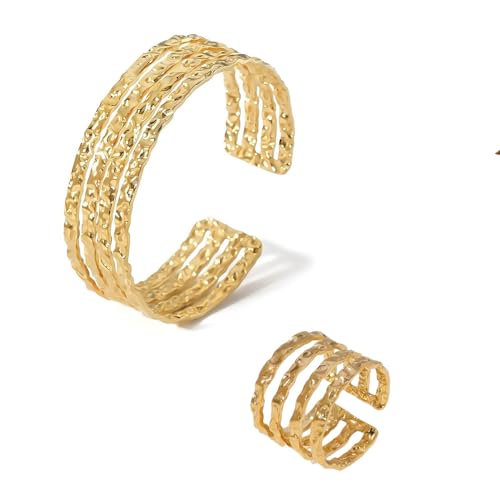 Generic - طقم مجوهرات سوار عريض متعدد الخيوط من الستانلس ستيل مطلي بالذهب عيار 18 قيراط للنساء، هدية رائعة للصداقة وعيد الحب - قابل للتعديل
