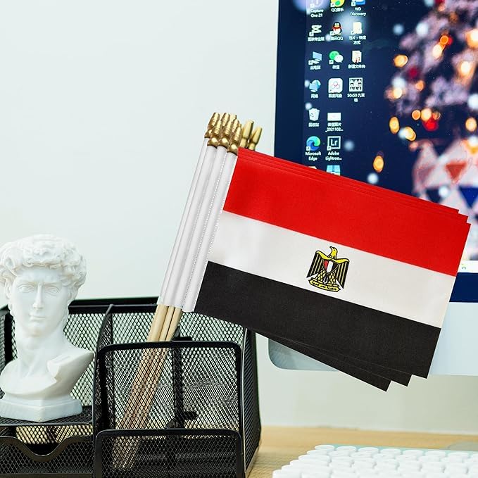 - حجم مثالي للتلويح: يبلغ حجم كل علم 14 × 21 سم مع عصا بلاستيك متينة طولها 30 سم، مثالي للحمل باليد أو للعرض على المكاتب والأماكن التزيينية.