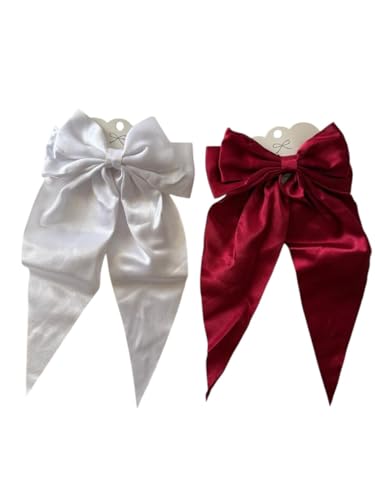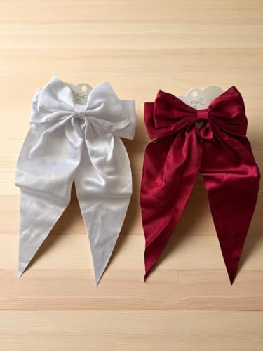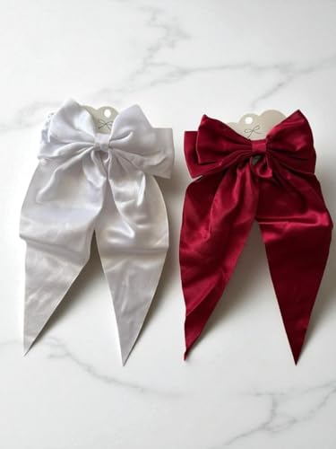 Generic - شريط تزيين بفيونكة، ملاقط شعر ذات ذيل منسدل، ربطة شعر من الستان بطبقتين للسيدات والصغيرات، زينة شعر بلون موحد، أبيض وأحمر غامق، 2 قطعة، طويل 1