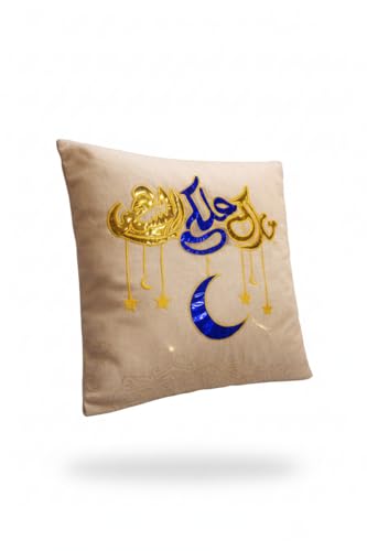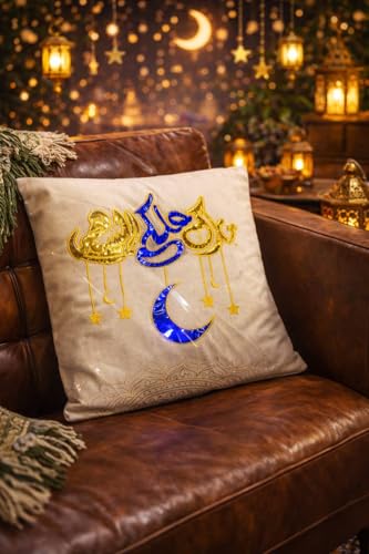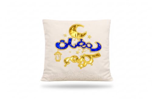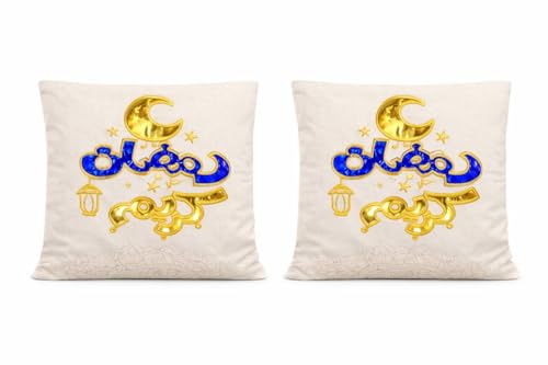 - تصميم رمضاني فاخر: طقم كوشن مكون من قطعتين بتطريز يدوي راقي يحمل رموز رمضانية مميزة بألوان ذهبية وزرقاء تضفي أجواء روحانية على منزلك