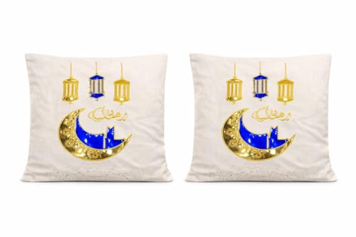 Generic - طقم وسائد رمضانية مطرزة يدوياً، قطعتين، قماش كتان، أزرق وذهبي، 45×45 سم، تصميم هلال وفانوس