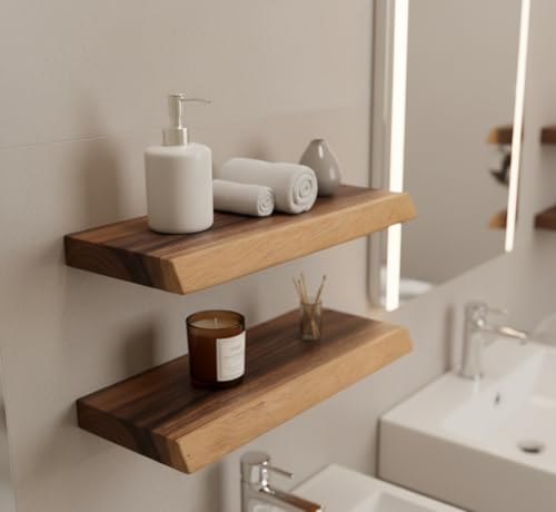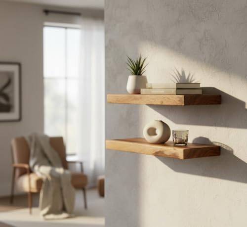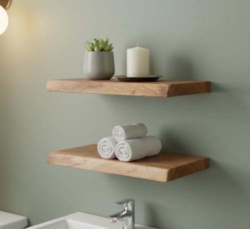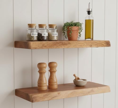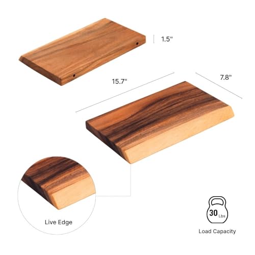 MIDUSO - مجموعة من 2 رف حائط عائم من الخشب الصلب 8 × 15.8 × 1.4 انش - رف خشبي طبيعي للديكور الريفي والعصري