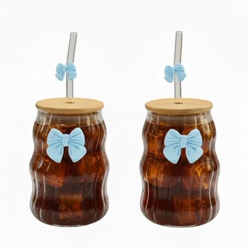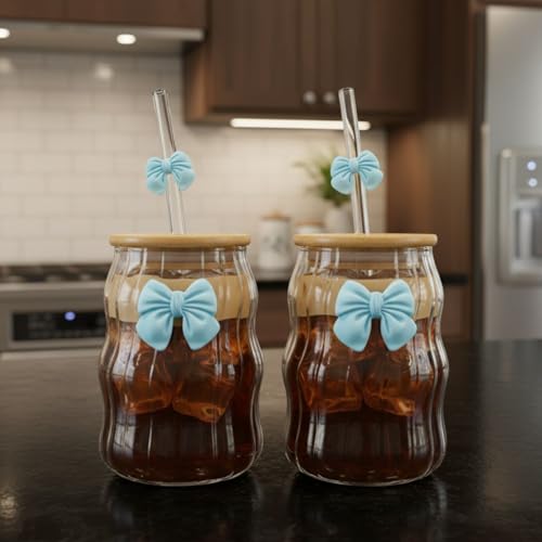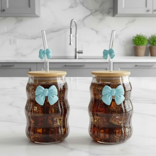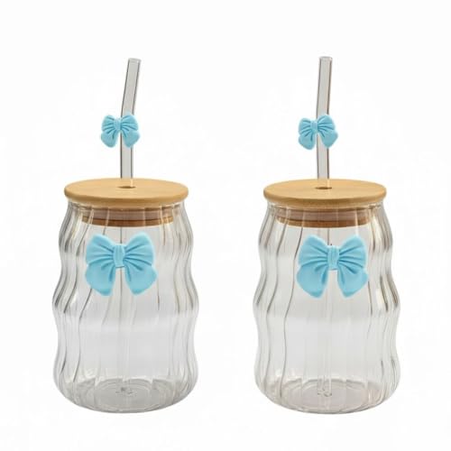 Generic - طقم 2 كوب زجاج مموج بغطاء بامبو وشفاط زجاج – تصميم فيونكة أنيق (ازرق)