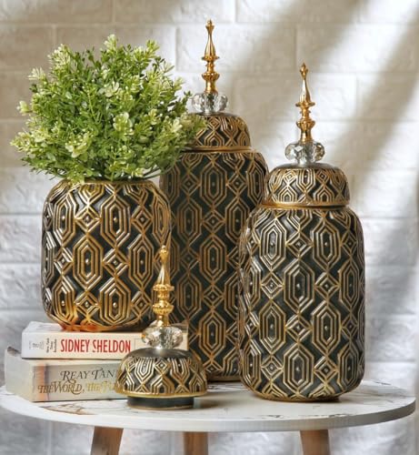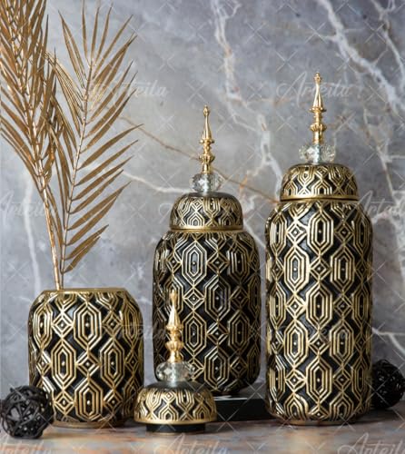Generic - مجموعة فازات مزخرفة عصرية وبسيطة لديكور المنزل، فازات سيراميك أنيقة لغرفة المعيشة والمكتب أو الرف أو قطعة مركزية للطاولة مثالية لعشب البامباس، (أسود وذهبي) 3 قطع