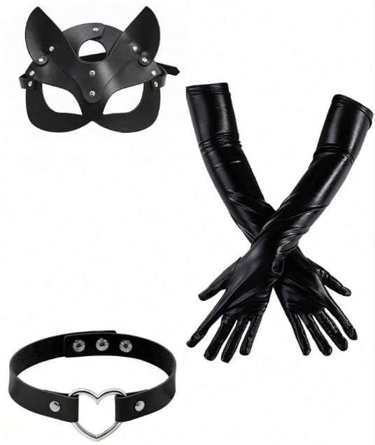Generic - مجموعة من 3 قطع، قناع عين مع اذنين، رصاصة قلب، قفازات جلدية 55 سم، اكسسوارات حفلات الهالوين