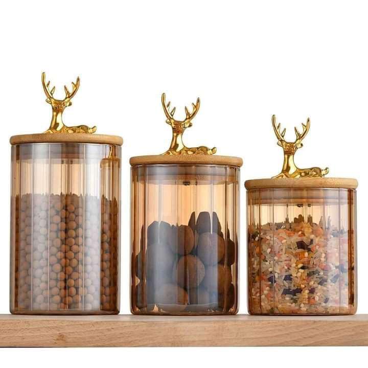 Generic - طقم أكواب زجاجية فاخرة مع مقابض ذهبية، 3 قطع، تصميم غزال ذهبي، لتخزين الحلوي او التوابل او البقوليات ايضاً