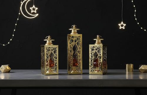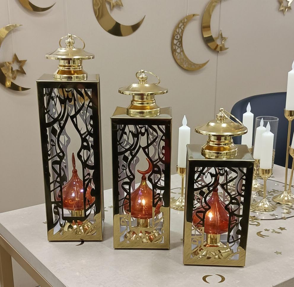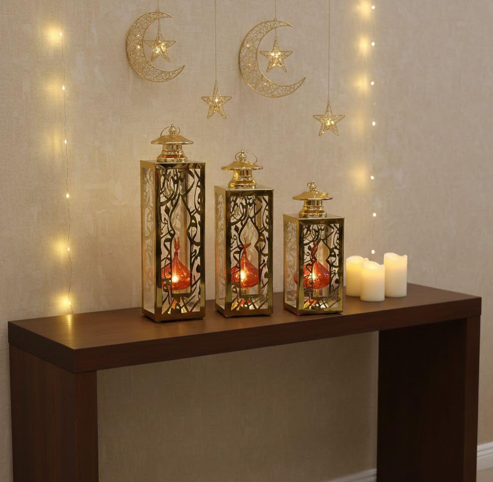 - طقم فوانيس رمضانية فاخر: يتضمن 3 قطع بتصميم معدني ذهبي مع تفريغ أنيق يعكس الروح الرمضانية الأصيلة ويضيف لمسة من الفخامة لديكور منزلك