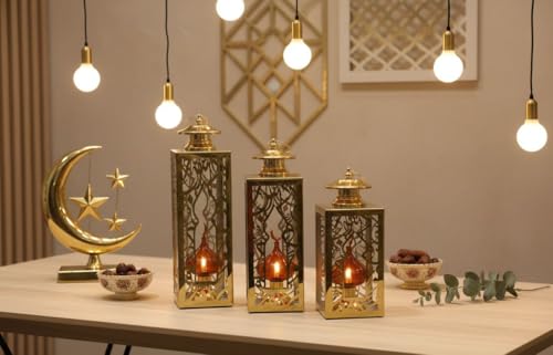 Generic - طقم 3 قطع فوانيس رمضانية LED معدنية، ذهبي، إضاءة دافئة، تصميم مفرغ أنيق، ارتفاع 35-30-25 سم، ديكور رمضان فخم