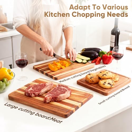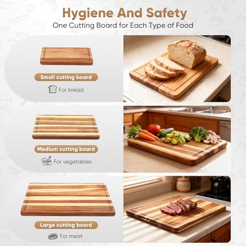 - نظام علمي من 3 مقاسات: مجموعة ألواح تقطيع خشبية من 3: كبير (40.5 × 30 سم) للحوم، متوسط (32.5 × 23.5 سم) للخضروات والفواكه، صغير (25.5 × 17.5 سم) للطعام الجاهز. من خلال فصل الطعام النيء والمطبوخ، يتم تجنب التلوث المتبادل - لإعداد صحي ومنظم.
