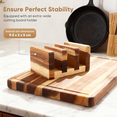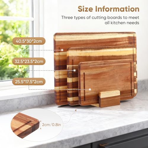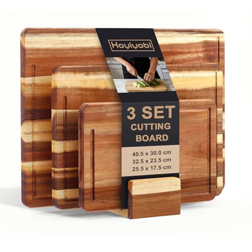 Hoyiyobi - مجموعة من 3 الواح تقطيع خشبية، 40.5 × 30/32.5 × 23.5/25.5 × 17.5 سم، الواح تقطيع خشب اكاسيا عالية الجودة مع حامل لوح، الواح خشبية سميكة 2 سم مع اخدود للعصير، الواح خبز للافطار