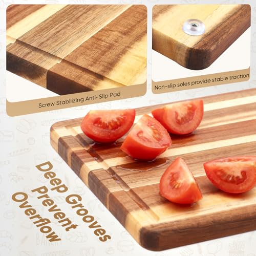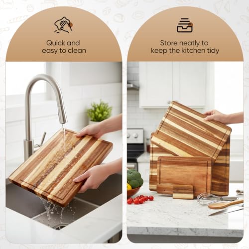 - خشب أكاسيا عالي الجودة - صحي ومتين: ألواح التقطيع الخاصة بنا مصنوعة من خشب الأكاسيا الصلب بكثافة عالية، وهو مقاوم للتشققات والتشوه. يمنع السطح الخشبي الصلب للغاية الجروح العميقة ويضمن تجربة طبيعية آمنة. السطح الأملس سهل التنظيف ولا يمتص الروائح - لمزيد من النظافة والسلامة في مطبخك.