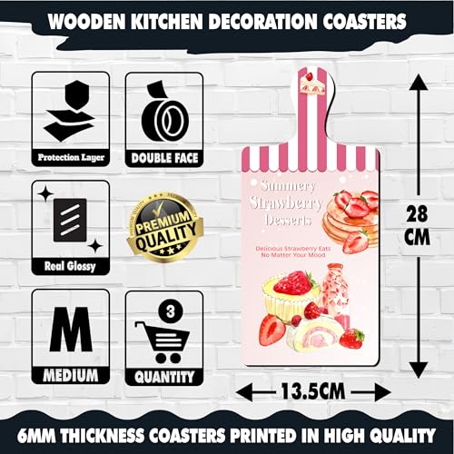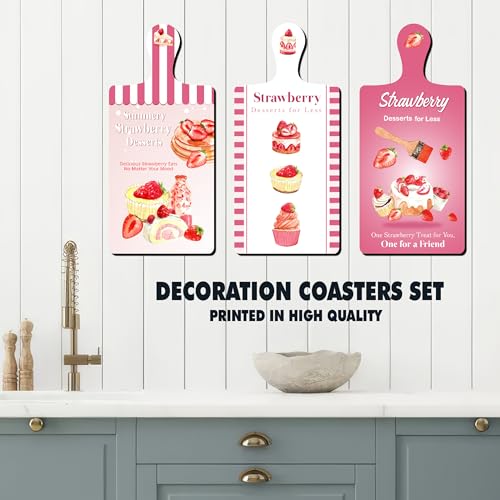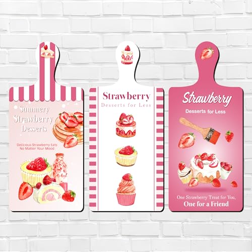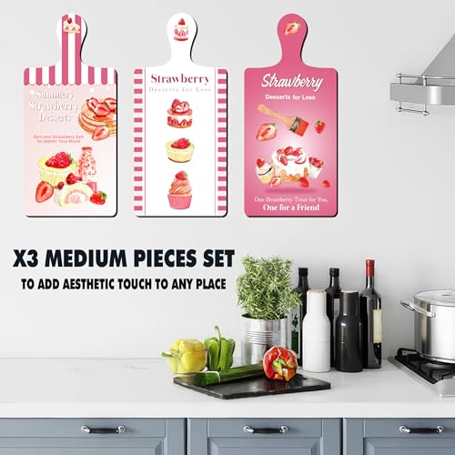 Generic - مجموعة 3 قطع ديكور خشبية للحائط بتصميم كوستر أو بلانشة تقطيع مطبوعة برسومات فاكهة وكيك الفراولة بينكي، لاصقة بدبل فيس، مقاس 28×13.5 سم، طباعة لامعة عالية الجودة مع طبقة حماية مقاومة للأتربة والتآكل