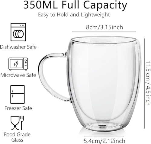 HOME ZONE - Set of 4 Double Walled Glass Coffee Mugs with Handles, 12oz Clear Coffee Mugs for Hot/Cold Beverages, Insulated Borosilicate Glass Cups for Cappuccino, Espresso, Latte, Tea, Milk (350ML)