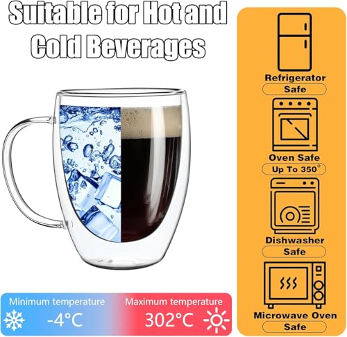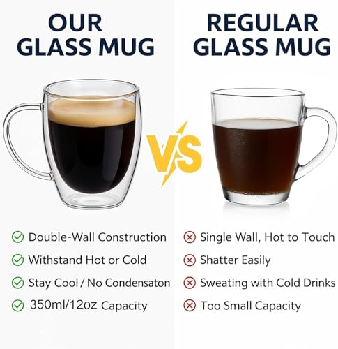 - 【DOUBLE WALL DESIGN】 - The double walled glass coffee mugs design of this utilizes double-layer technology. When the inner layer becomes hot, the outer layer will not heat up, protecting your hand from scalding and maintain the temperature of the beverage.