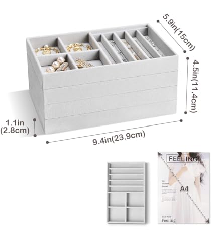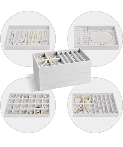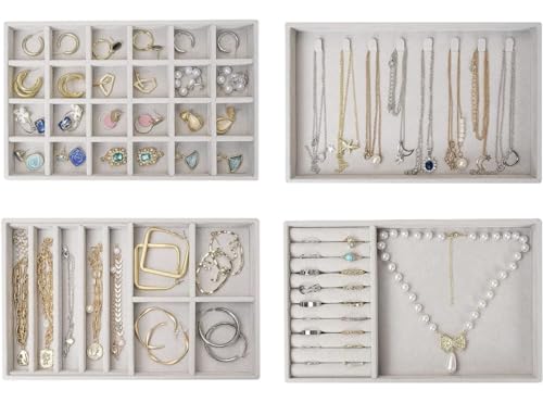 Daga - مجموعة صواني لتنظيم المجوهرات، للحلقان والقلادة والخواتم والأساور،لون رمادي، مجموعة من 4 صواني، سنط