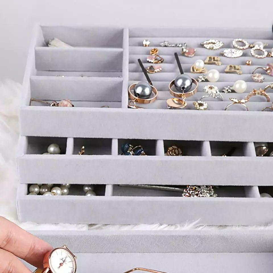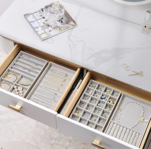 - * مجموعة من 4 قطع يمكن أن تحمل عشرات المجوهرات، مما يسمح لك برؤية كل شيء، أسهل وأسرع بكثير لالتقاط العناصر المناسبة لارتدائها مع ملابسك، وفر وقتك وتجعل حياتك أسهل بكثير؛ لا مزيد من القلائد المتشابكة أو البحث عن أقراط مطابقة* تصميم فواصل داخلية قابلة للإزالة، حتى تتمكن من تغيير حجم الأقسام وفقًا لاحتياجات التخزين الشخصية الخاصة بك، مثالية لفصل المجوهرات الخاصة بك مثل الأذن ليتس ودبابيس ودبابيس وخواتم وغيرها من المجموعات