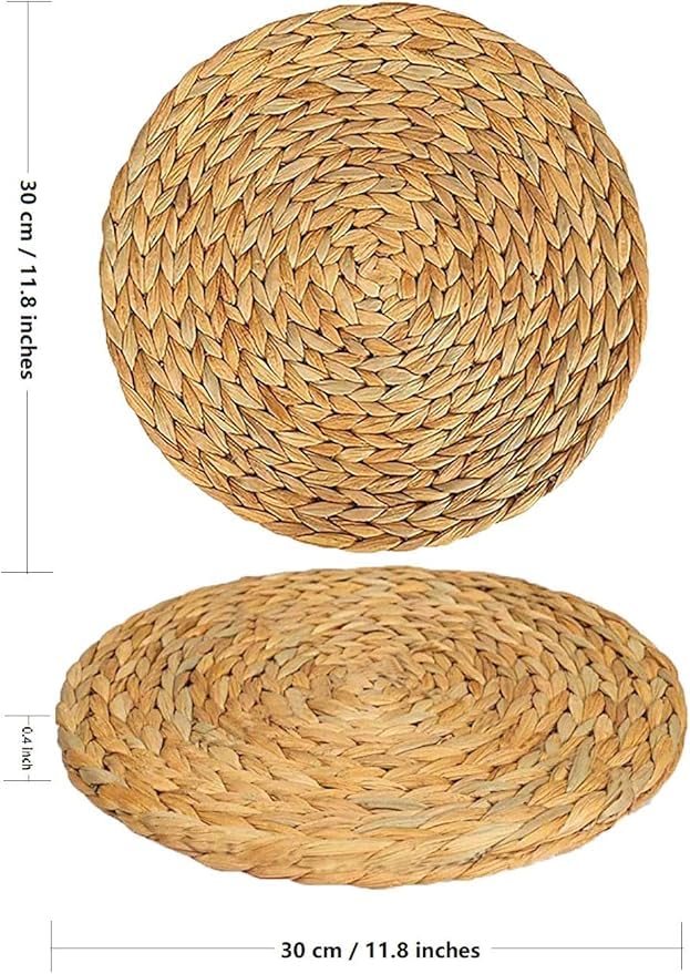 - 1、مادة المنتج: مفارش منسوجة مضفرة من القش مجموعة من 4 قطع، بقطر 30 سم تقريبًا، تستخدم كمفارش مستديرة منسوجة، أو حصيرة ساخنة كبيرة أو حوامل للأواني.