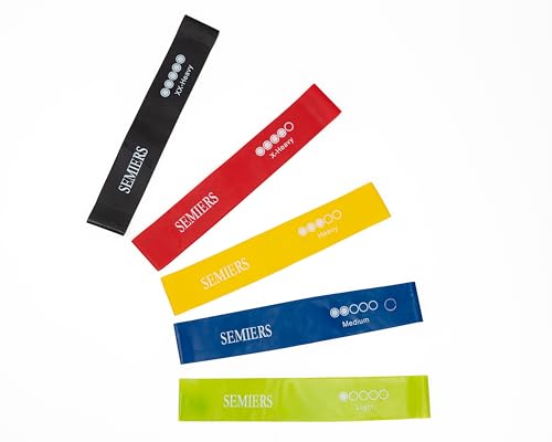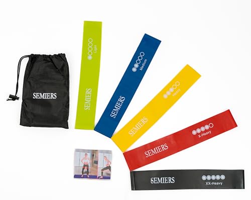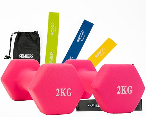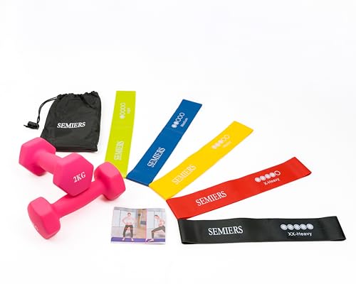 SEMIERS - مجموعة من 5 أحزمة مرنة من اللاتكس للياقة البدنية والعضلات + دامبل وأثقال نيوبرين، متوفرة بوزن 1.5 كجم/ 2 كجم/ 3 كجم (تباع في أزواج) للتمرين في المنزل