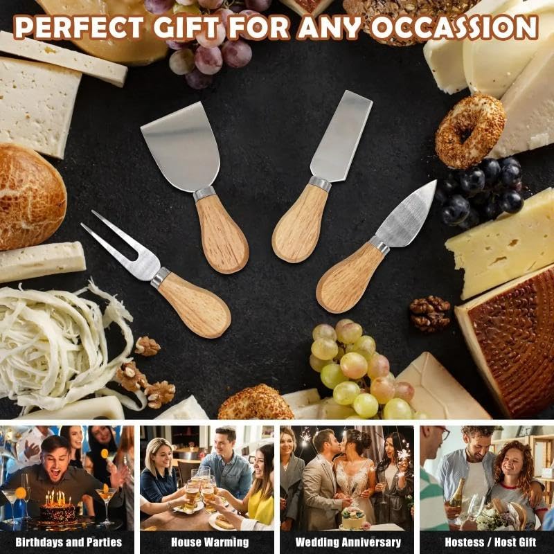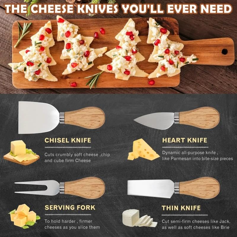 - استخدامات سكاكين رفيعة متنوعة: مصممة لتقطيع الأجبان شبه الصلبة مثل الجاك أو الشيدر، بالإضافة إلى الجبن الطري مثل البري. 1 × سكين بتصميم على شكل قلب: سكين ديناميكي متعدد الأغراض رائع لتقطيع الجبن الصلب مثل البارميزان إلى قطع صغيرة الحجم. سكين التقديم: تستخدم ببساطة للتقديم للضيوف، أو لأجبان صلبة وأكثر صلابة أثناء تقطيعها. سكين ازميل: تقطع الجبن الطري المتفتت أو تالجبن الصلب مثل البارميزان وايمنتالر واسياجو وجبن الشيدر القديم إلى شرائح أو مكعبات.