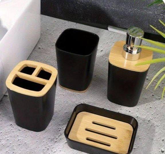 - يشمل الطقم: باسكت فمامه بغطاء خشبي، فرشة تواليت بالقاعدة، حامل فرش أسنان مقسم، كوب متعدد الاستخدام، صبانة، وديسبنسر شاور.