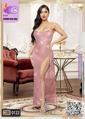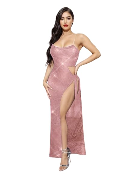 Generic - فستان سهرة طويل وردي لامع، تصميم مثير بفتحة جانبية، حمالات رفيعة