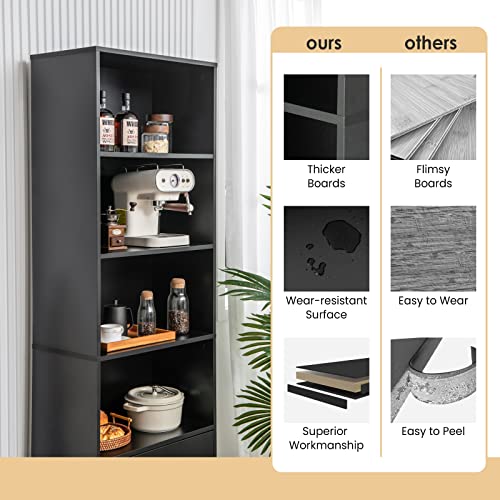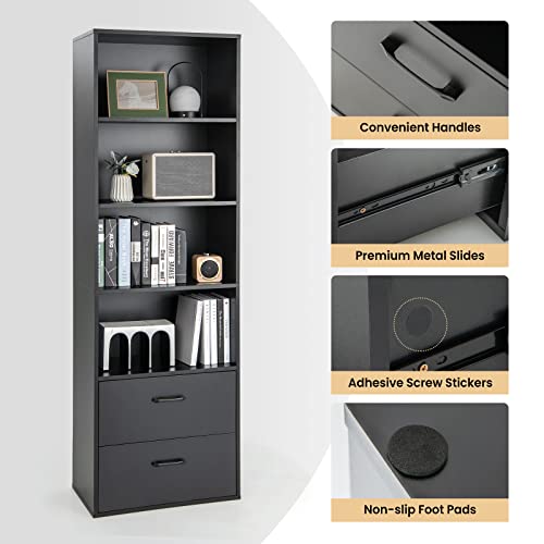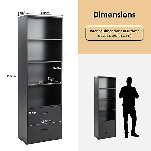 SFAREST - خزانة كتب خشبية من سفاريست طويلة قائمة على الارض مع ارفف مفتوحة 4 طبقات ودرجين وجهاز مضاد للانقلاب وحدة تنظيم للمنزل وغرفة المعيشة والمدخل اسود خشب مُصنع