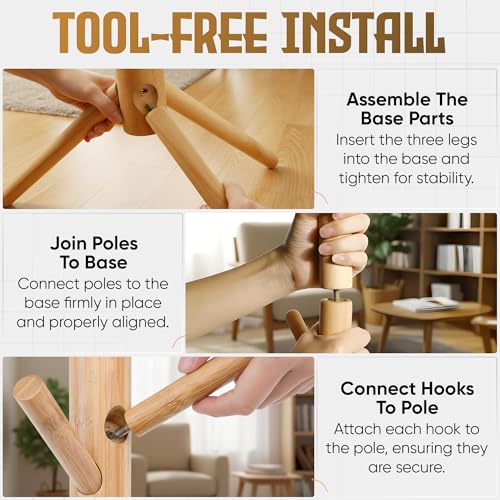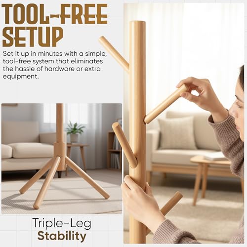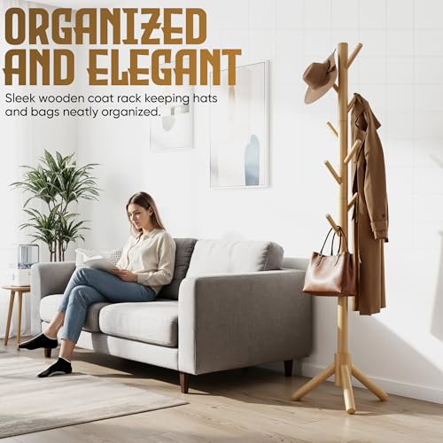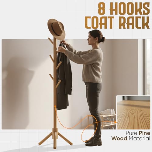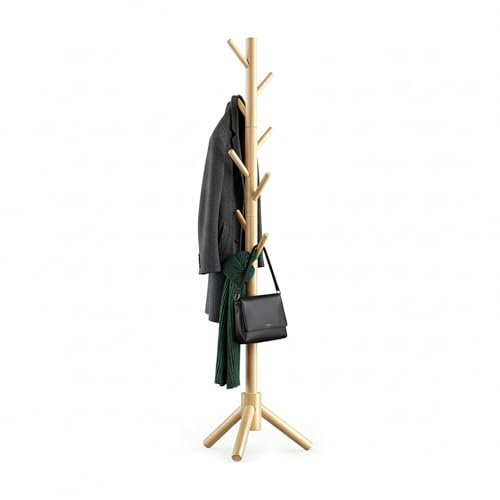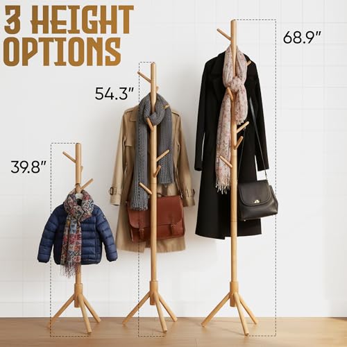 SG Traders - حامل معاطف خشبي من اس جي تريدرز، 3 حوامل للمعاطف بتصميم أشجار مع ارتفاع قابل للتعديل و8 خطافات، حامل معاطف لمدخل الرواق، حامل معطف لقاعة الملابس والفساتين والجاكيتات (خشب طبيعي)