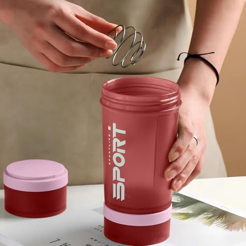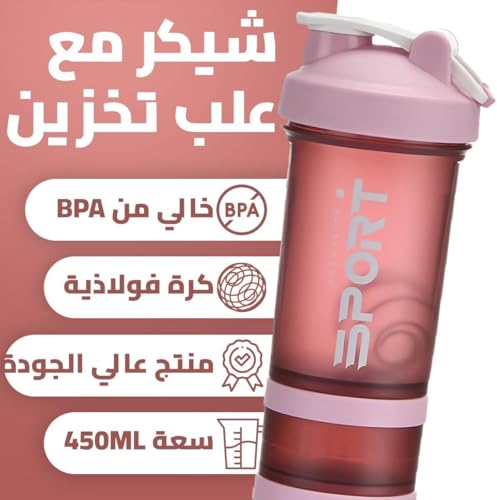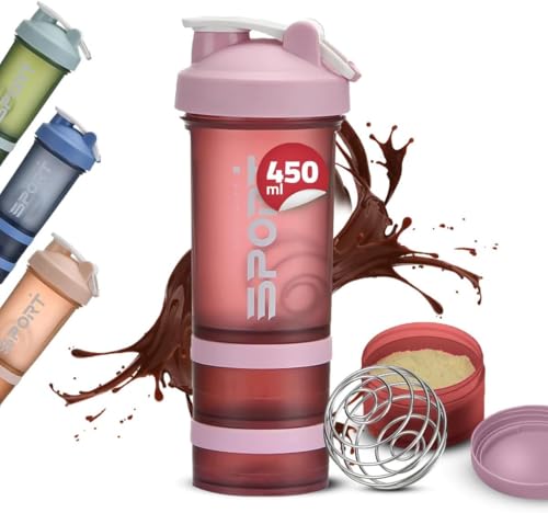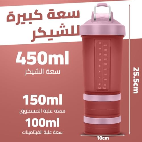 Generic - زجاجة شيكر مع منظم حبوب دواء ومكان لتخزين مسحوق البروتين سعة 450 مل، زجاجة مياه رياضية ثلاثية الطبقات مانعة للتسرب بقفل لولبي خالية من مادة بيسفينول أ ومثالية للجيم واللياقة البدنية والسفر (وردي)
