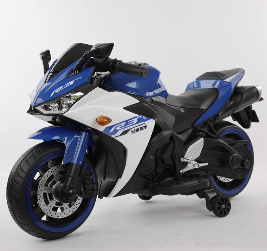 SHAKYA WORLD - لعبة دراجة موتوسيكل R3 تعمل بالبطارية للأطفال مناسبة للأعمار من 2 إلى 7 سنوات من شاكيا ورلد، ، لون أزرق وأبيض