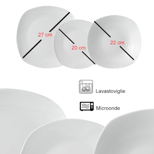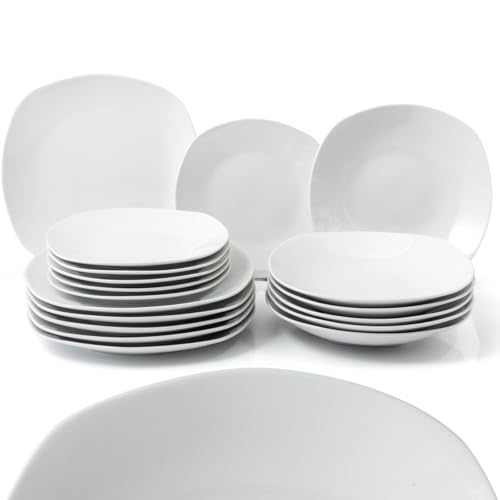 Shally Dogan - طقم عشاء بورسلين من شالي دوجان مكون من 18 قطعة لـ 6 أشخاص، مجموعة من 6 أطباق عشاء و6 أطباق قاعدة و6 أطباق حلويات وفاكهة، تصميم عصري ناعم (أبيض مربع)