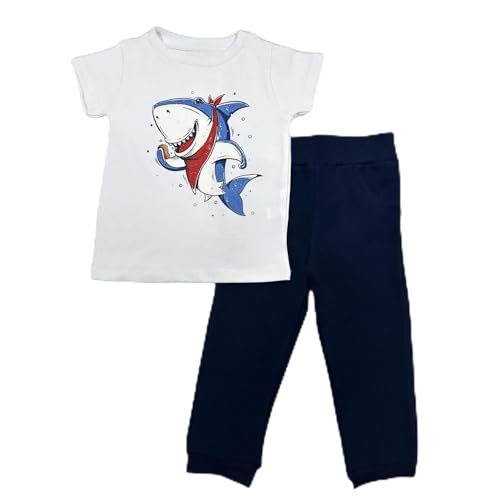 Baby Co. - طقم قطن بتصميم سمكة قرش (تي شيرت ابيض + بنطلون رياضي كحلي)