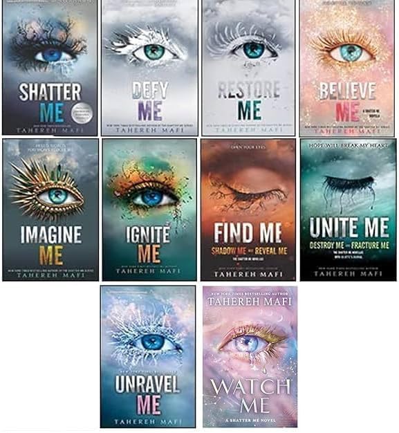 - أسماء الكتب: Shatter me وunravel Me REstore me وDefy me وfind Me وIgnite me وunite me وWatch me وimagine me وbelieve me.