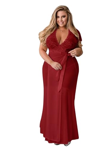 Generic - لانجري شفاف طويل بالدانتيل مع ربطة خصر وشق أمامي