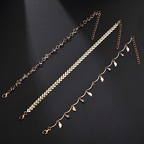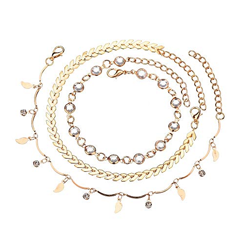 Shegirl - خلخال ثلاثي الطبقات بدعامات كريستال على شكل عظم السمكة اكسسوارات ذهبية ورقة شجر مجوهرات قدم عصرية للنساء والفتيات