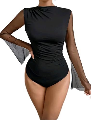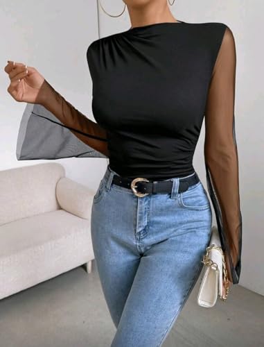 عام - بلوزة للنساء من شي ان بتصميم شبكي انيق باكمام واسعة - بلوزة رقصة ضيقة مكشكشة وقصة ضيقة للحفلات مقاس M
