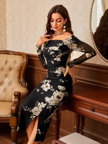 Generic - فستان من شي ان مصنوع من الميش برقبة غير متناظرة للنساء بقصة فيتد مع جانب مكشكش وحاشية مشقوقة وشبك علوي بنقشة فلورال