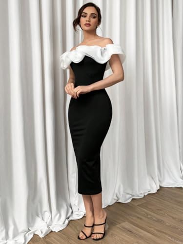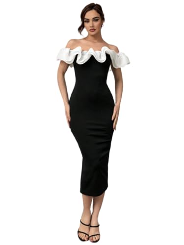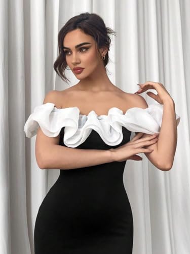 Generic - فستان كوكتيل طويل من شي ان بتصميم خارج الكتف، للنساء، قصة فيتد، بأكمام أوف شولدر، قابل للتنفس، باللونين الأسود والأبيض