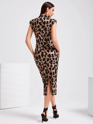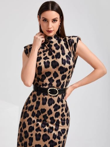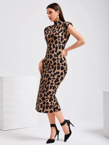 Generic - فستان للنساء من شي ان - فستان كوكتيل انيق بطباعة جلد الفهد مع وسادات كتف وفتحة ظهر وقصة ضيقة - سهرة انيقة وبدون حزام