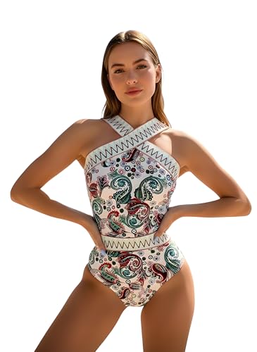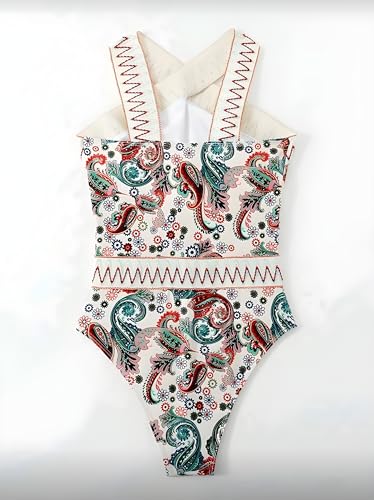 Generic - بدلة سباحة اف ايه من شي ان، ملابس سباحة صيفية للشاطئ بنمط بيزلي شيفرون مخطط برقبة عالية، ملابس سباحة قطعة واحدة للنساء