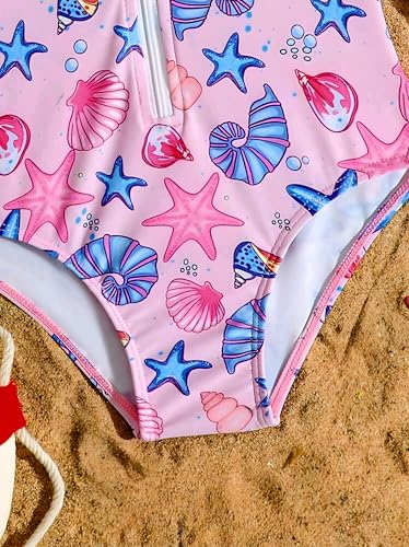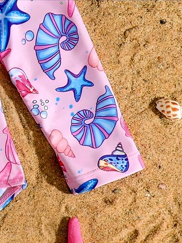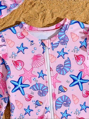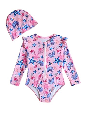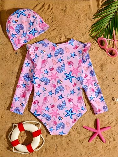 Generic - مايوه قطعة واحدة للبنات باكمام طويلة مكشكشة وطبعة صدف ونجوم لطيفة مع قبعة سباحة من شي ان
