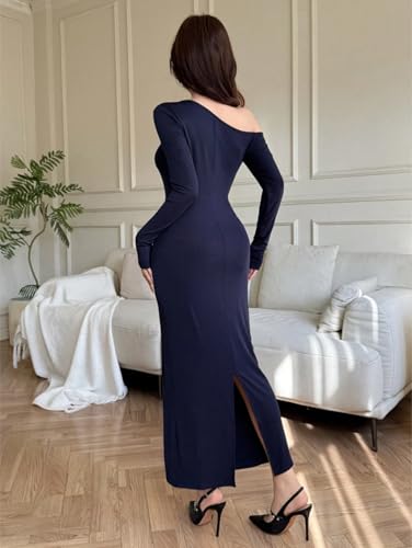 Generic - SHEIN Women Dress - Blue Asymmetrical Mid-Length Bodycon with Metal Decor - Elegant Hollow Out Long Sleeve Fitted for Party - High Stretch Midi Cocktail Dress